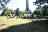 We took our time strolling along, a motley string of adults, children and dogs enjoying the sunshine and fresh air, taking turns to push George in his buggy (well, not the dogs, obviously). We stopped by the cascade, a cool respite, a good excuse for a photo shoot, before moving on to admire the ancient Roman ruins from Lepcis Magna in Tripoli. Onward and upward we trod our merry way. The chosen route had been on the flat but now the ground rose, the path steep in a long, hard slog uphill in the heat and I fell behind, stopping frequently to rest and catch my breath. Above the treeline I could see the monument. Almost there, I thought, and pushed myself on. Only to find it was the 100 ft totem pole; I still had another half mile to go. This was definitely further than last year. Ahh well, quick rest, deep breaths and move on.