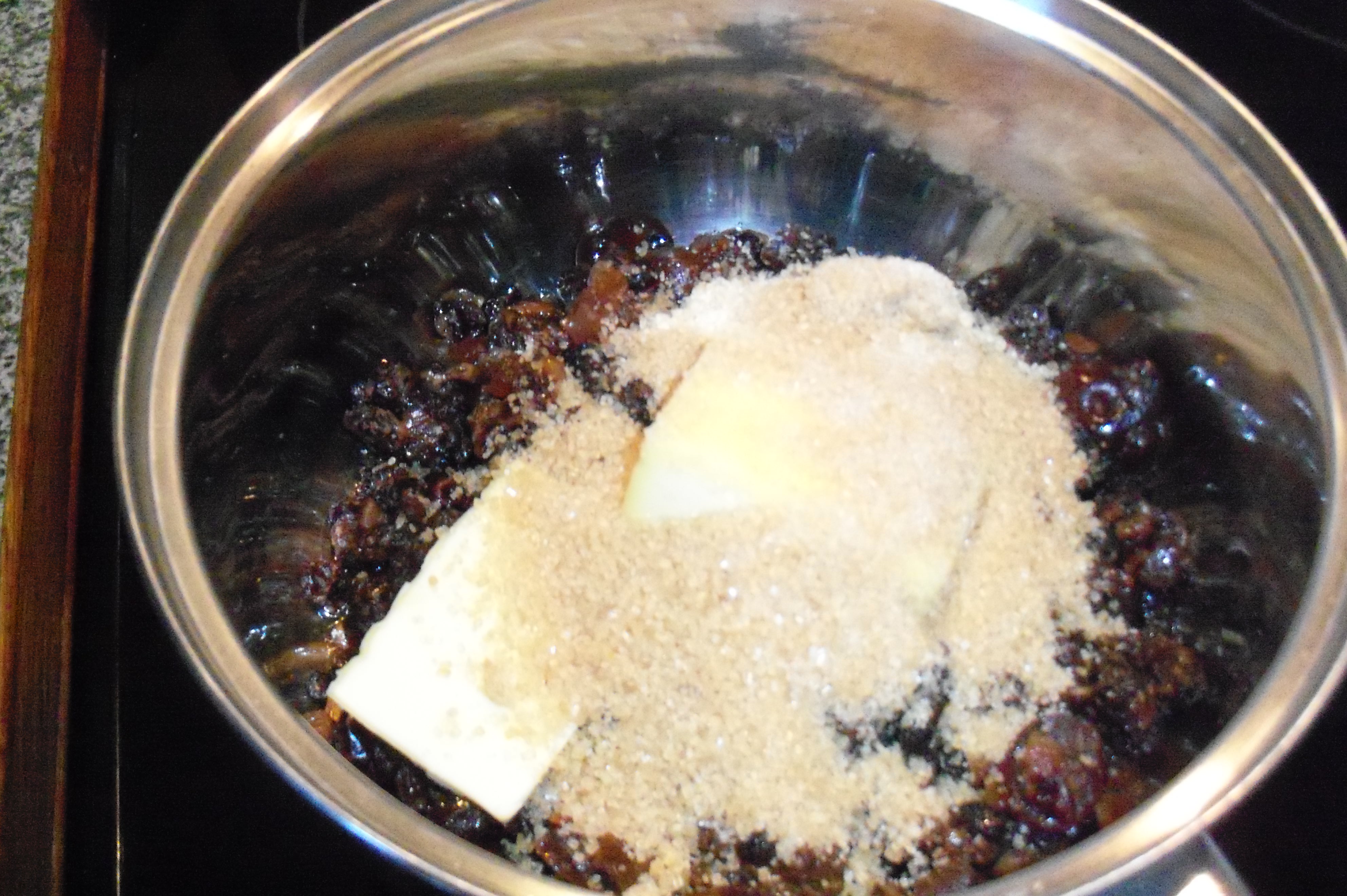 Into a large saucepan place soaked fruit including any remaining liquid. Add butter and sugar and on a low heat gently bring up to the boil and stirring occasionally, simmer for 2-3 minutes, ensuring butter and sugar have dissolved. Take off heat and leave to cool while you measure out the other ingredients, lightly beat the two eggs and put the kettle on to make a cup of coffee or tea to enjoy whilst fruit mixture is cooling.