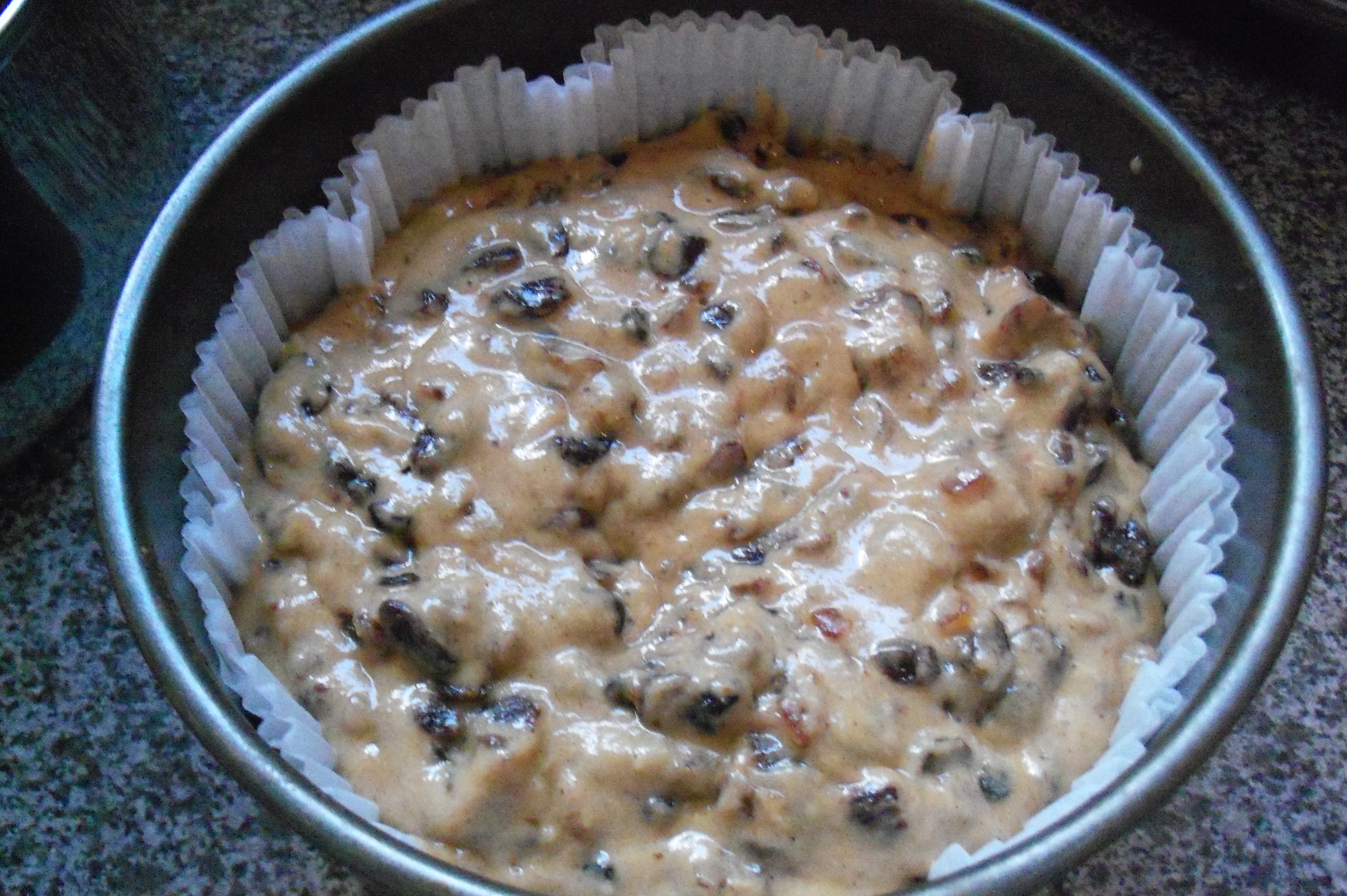 Grease a 8 inch loose bottom cake tin, be it round or square, or a 1lb loaf tin. Or, as I do, line the tin with two paper cases.